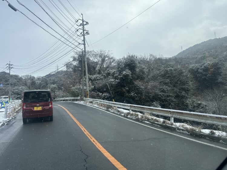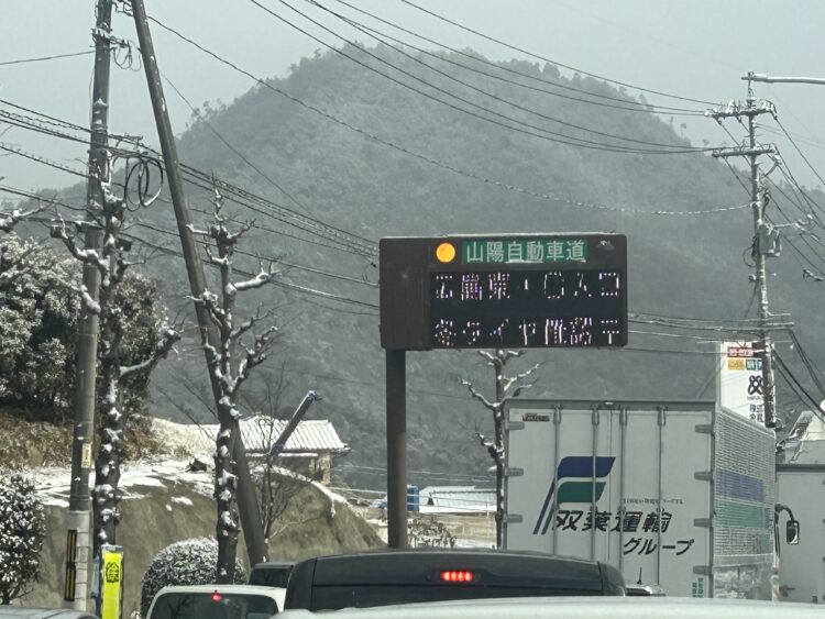 朝雪が降っており広島東インターまで通常15分で行